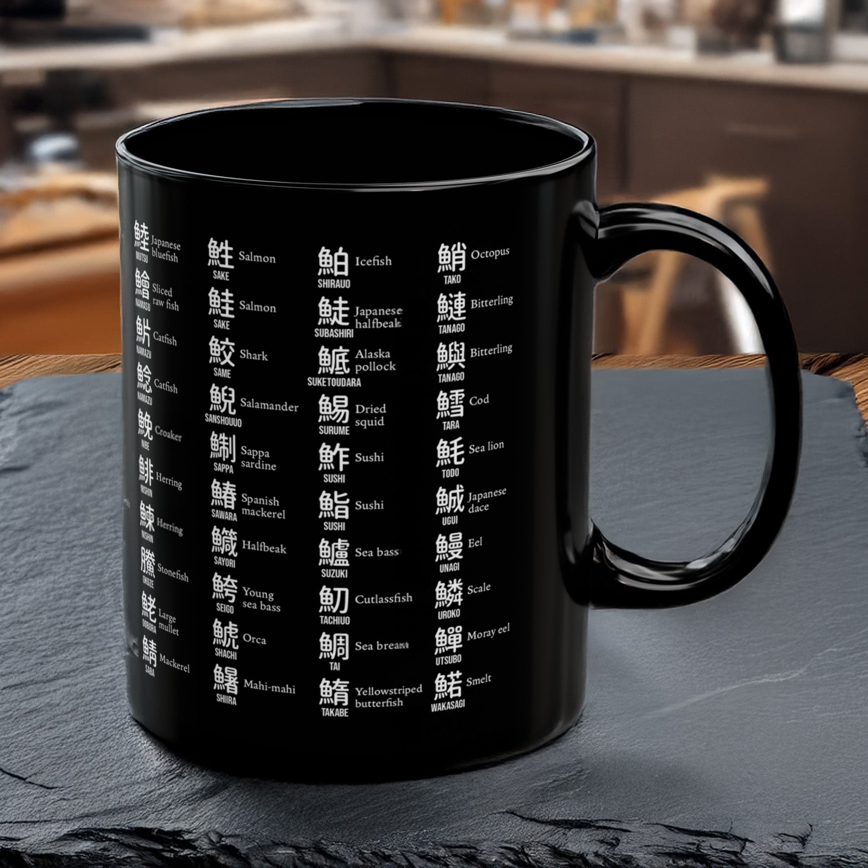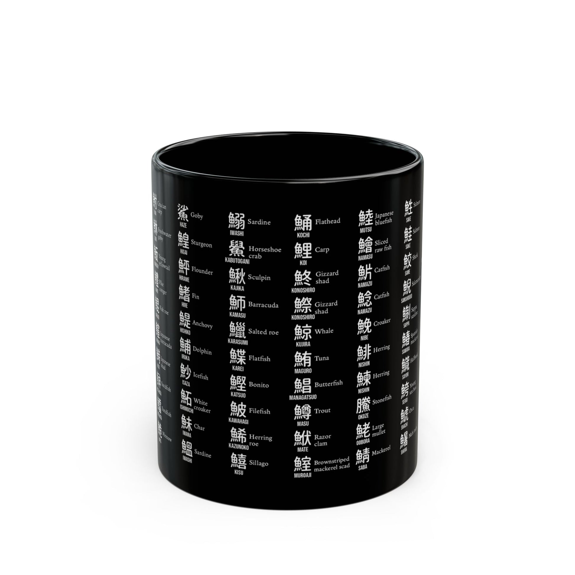A quiet homage to the fish of Japanese waters and the characters that name them. Each kanji on this mug is marked by the fish radical, forming a poetic catalog of language and tradition. From the soft curves of hiragana to the sharp bones of inked kanji, this piece invites contemplation as much as it does conversation.